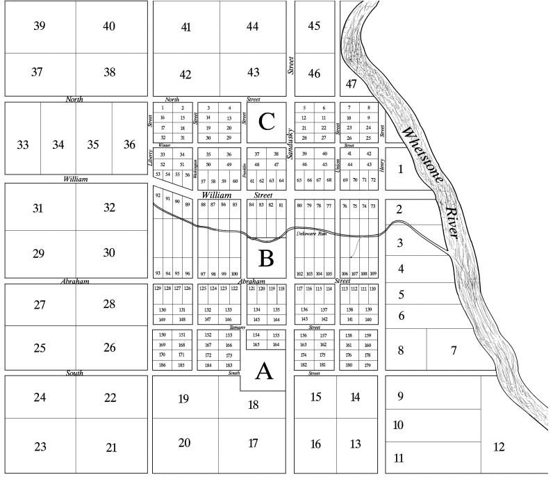 All the Streets are four poles wide except William, Abraham & Sandusky Streets which are six poles in width. The lots or squares including Delaware Run or which are not numbered extending from east to west through the Town is reserved for future disposal, or for the benefit of the Town as the proprietors may think proper hereafter.